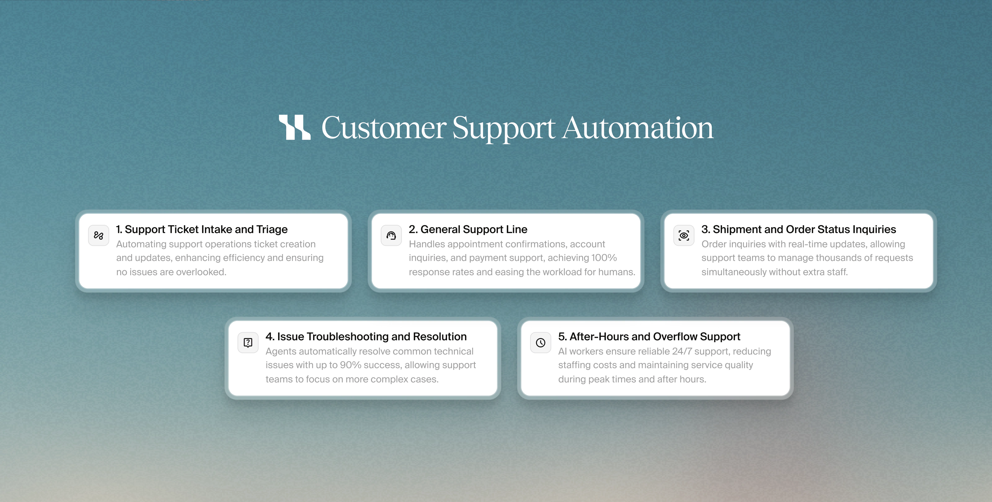 Below are five of the most common, high-value customer support applications HappyRobot customers are leveraging AI workers for today across channels (voice, web chat, email, and messaging) and languages: