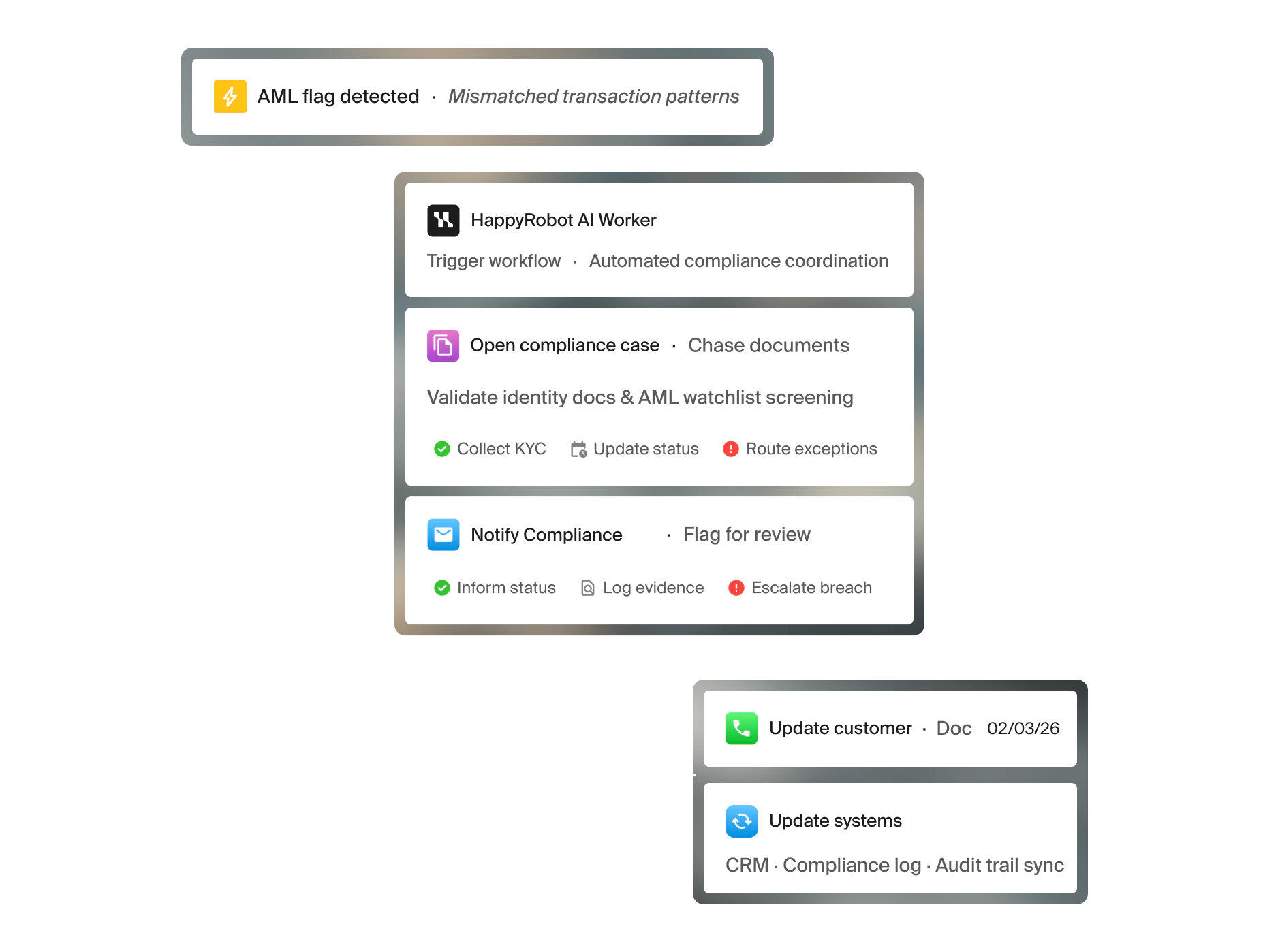 Banking runs on coordination between customer care, compliance, and collections. One missed trigger — a payment, a flag, a document — can cascade across all three.